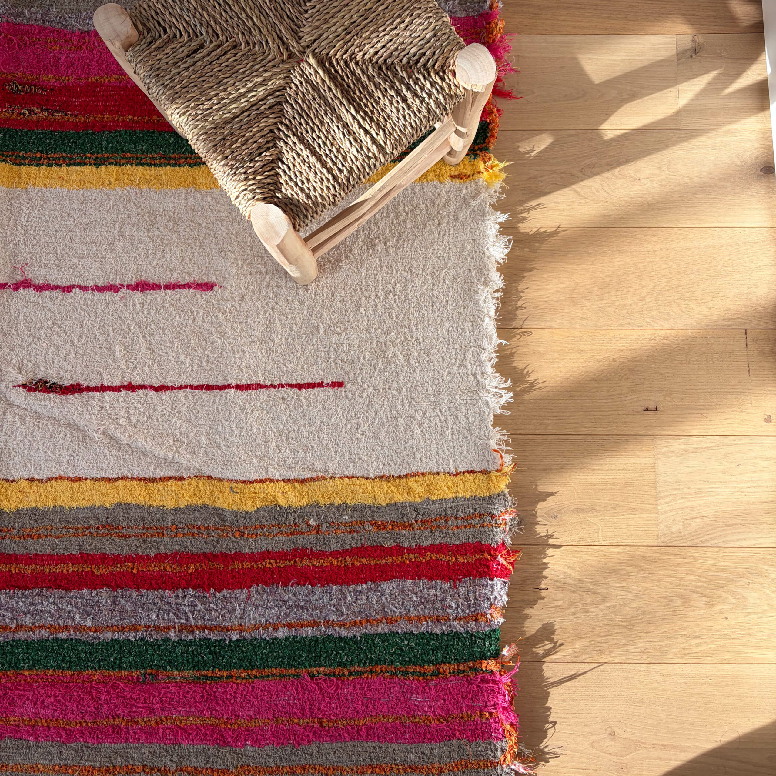 This rug is handmade in a small Andalusian village from recycled cotton. It has a tight, flat, single-sided weave, and both ends are carefully finished with a hem. Enjoy the soft texture, neutral color, and understated elegance.